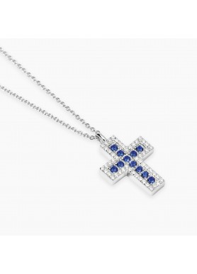 54,00 €Girocollo da donna regolabile in argento rodiato con catena rolò e pendente croce con zaffiri sintetici e zirconi bianchi.