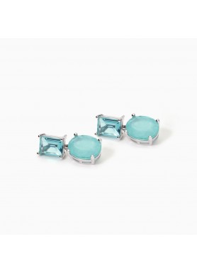 54,00 €Orecchini da donna in argento rodiato con glass azzurro taglio baguette, pendente in fusion stone di glass azzurro e cristallo di rocca taglio ovale.