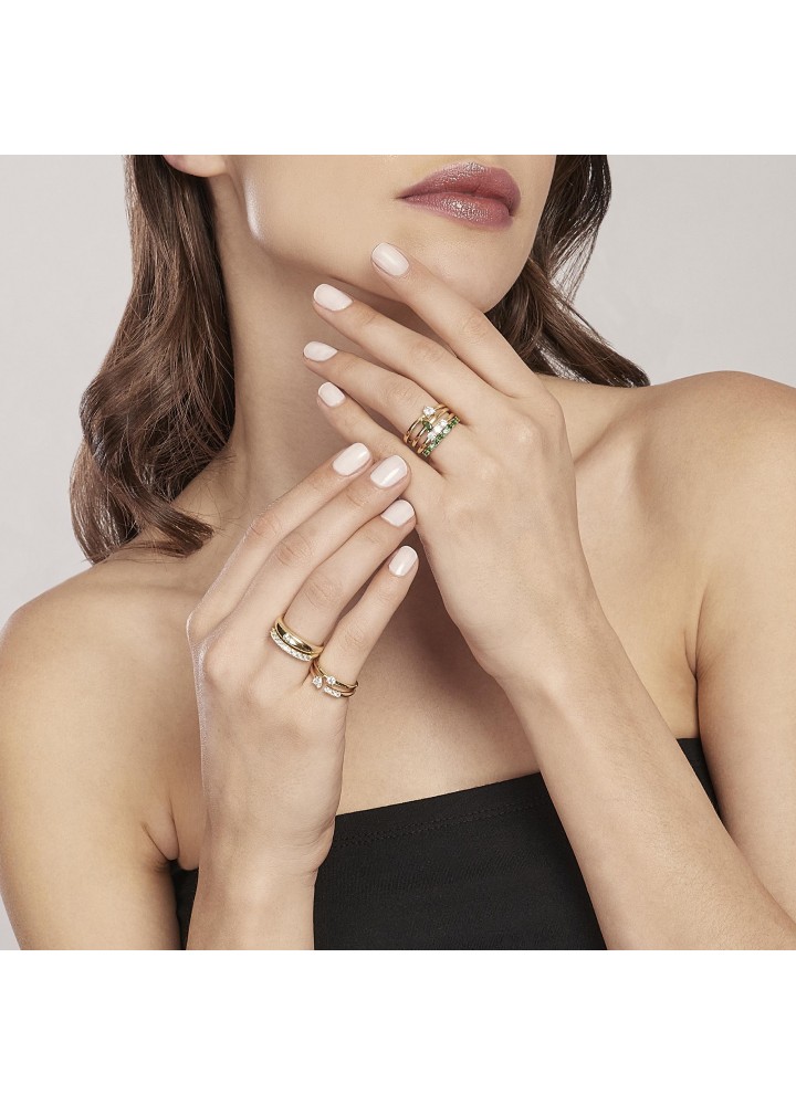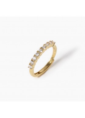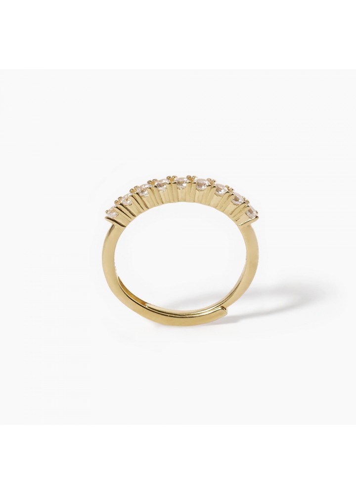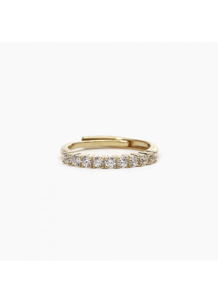 Anello riviera in argento dorato con nove zirconi. Incastonatura degli zirconi a griffe a quattro punte. Diametro degli zirconi: 2.25 mm. Misura regolabile, da 9 a 19. Referenza 523254