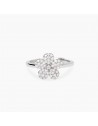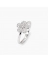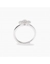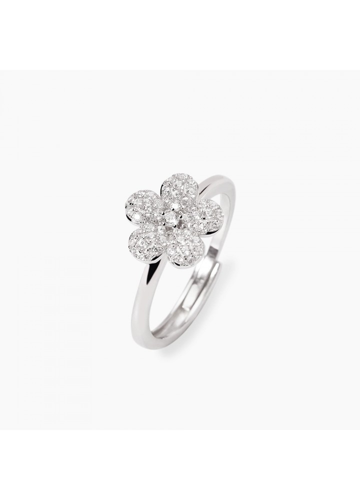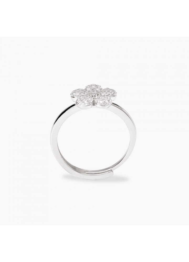 Anello regolabile in argento rodiato con fiore in zirconi bianchi.