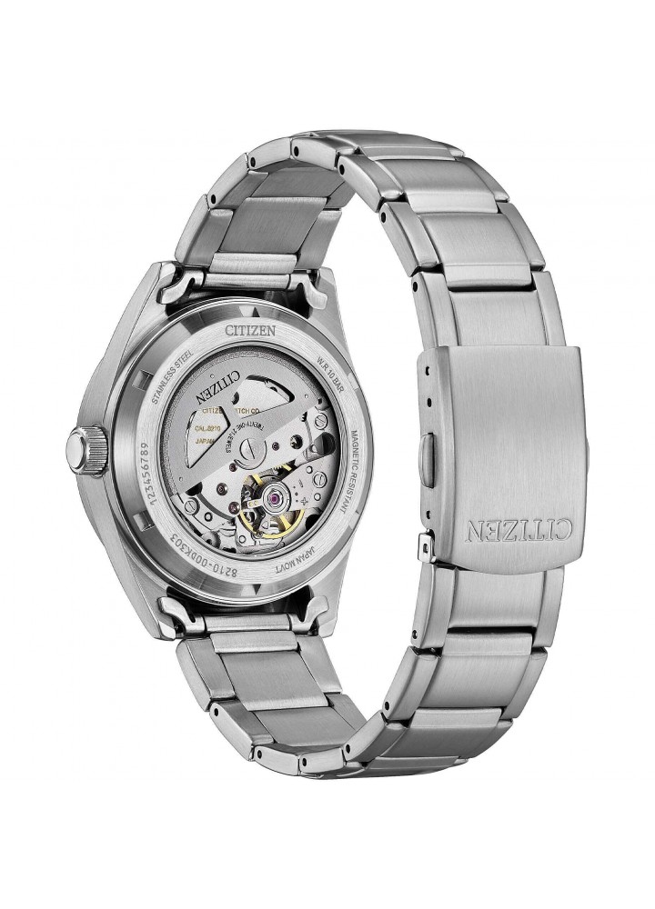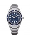 Orologio di Citizen della collezione OF Collection 2026. Orologio meccanico automatico da uomo con cassa in acciaio con fondello serrato a vite e oblò trasparente e diametro di 38,5 mm; quadrante blu con indici applicati e ghiera blu, vetro minerale. Bracciale in acciaio con chiusura a pulsante. Resistenza all’acqua di 10 ATM e movimento meccanico a ricarica automatica con 21 rubini e riserva di carica di 40 ore.