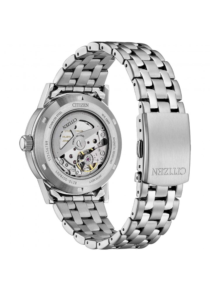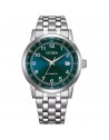 Orologio di Citizen della collezione OF Collection 2026. Orologio meccanico automatico da uomo con cassa in acciaio con fondello serrato a vite e oblò trasparente e diametro di 40 mm; quadrante Verde con numeri arabi e vetro minerale. Bracciale in acciaio con chiusura a pulsante. Resistenza all’acqua di 10 ATM e movimento meccanico a ricarica automatica con 21 rubini e riserva di carica di 40 ore