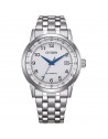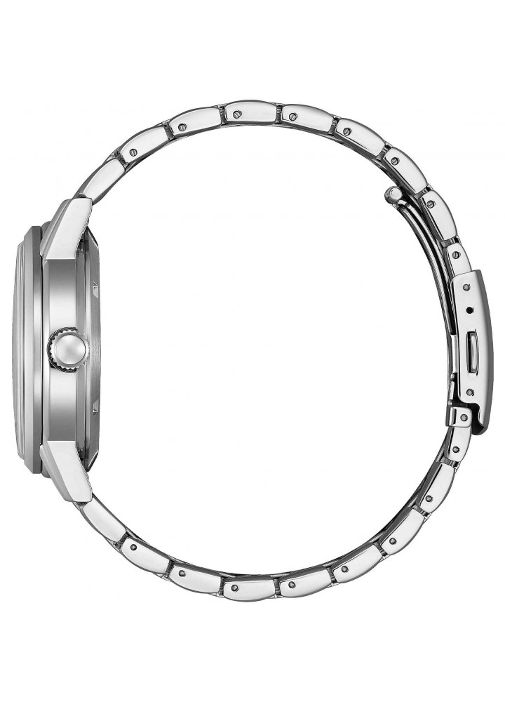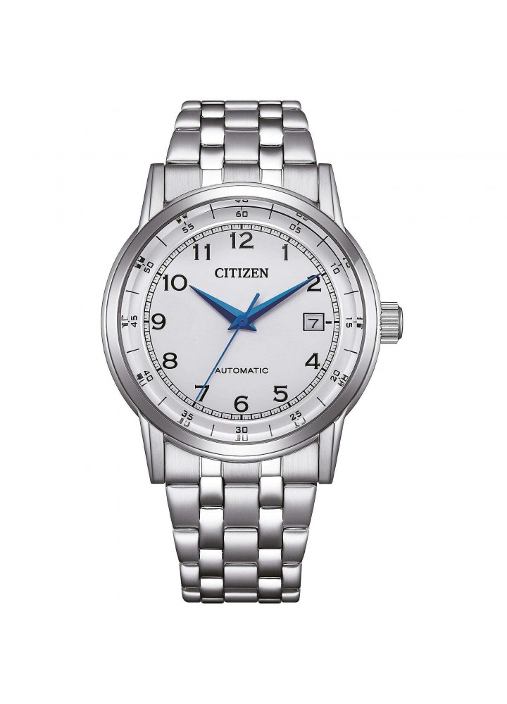 Orologio di Citizen della collezione OF Collection 2026. Orologio meccanico automatico da uomo con cassa in acciaio con fondello serrato a vite e oblò trasparente e diametro di 40 mm; quadrante bianco scuro con numeri arabi e vetro minerale. Bracciale in acciaio con chiusura a pulsante. Resistenza all’acqua di 10 ATM e movimento meccanico a ricarica automatica con 21 rubini e riserva di carica di 40 ore