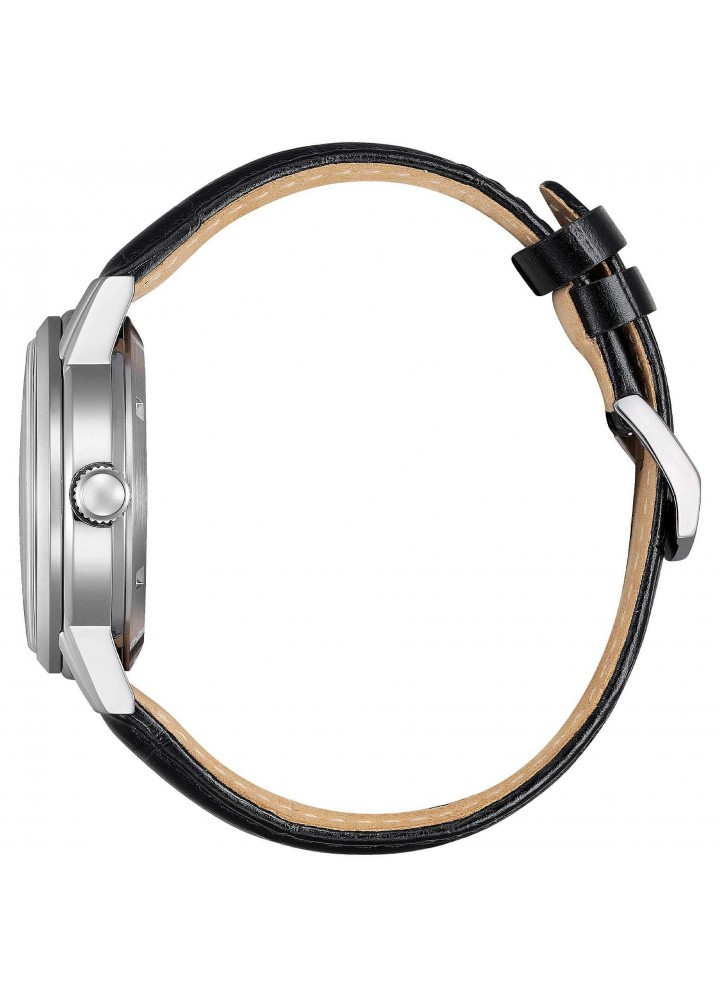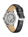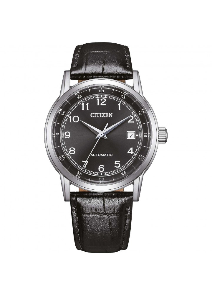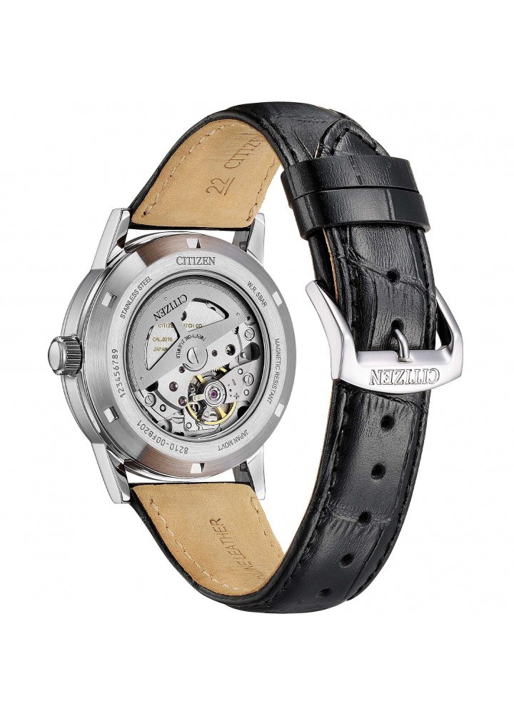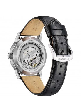 Orologio di Citizen della collezione OF Collection 2026. Orologio meccanico automatico da uomo con cassa in acciaio con fondello serrato a vite e oblò trasparente e diametro di 40 mm; quadrante nero con numeri arabi e vetro minerale. Cinturino in pelle nera. Resistenza all’acqua di 10 ATM e movimento meccanico a ricarica automatica con 21 rubini e riserva di carica di 40 ore.