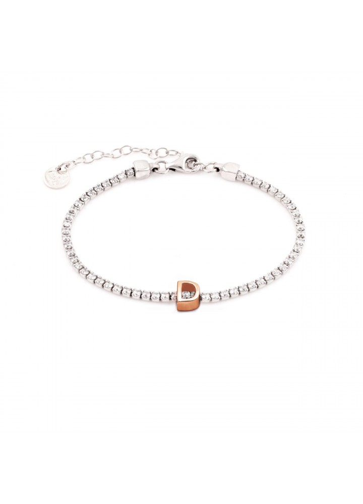 Bracciale, tennis di zirconi, D placcata oro rosa. Lunghezza: 15 – 19 cm. Argento 925 Made in Italy.