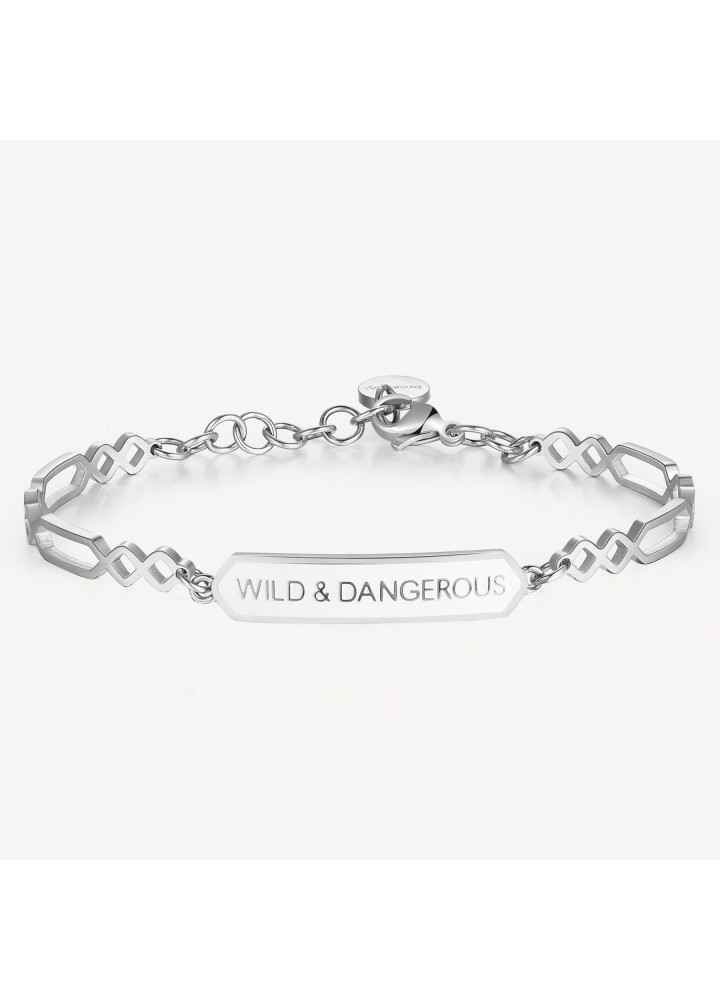 SELVAGGIA, SPERICOLATA, PASSIONALE Mi piace correre a piedi nudi e lasciarmi andare alle emozioni più pure vivendo di pura adrenalina. Sono così: istintiva, selvaggia e passionale. Bracciale semirigido in acciaio 316L con barretta centrale con incisione Wild & Dangerous e smalto bianco.