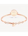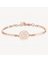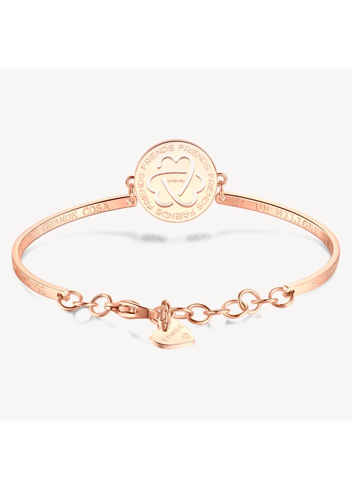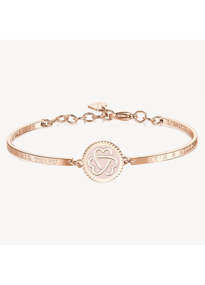 Bracciale semirigido in acciaio 316L e pvd oro rosa con cuori intrecciati e smalto rosa.