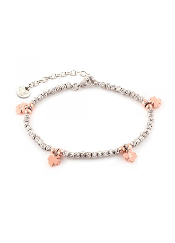 Bracciale multicharm, boule diamantate bicolore, Quadrifogli placcati oro rosa con punto luce e lisci. Lunghezza: 15 – 19 cm. Argento 925 Made in Italy.