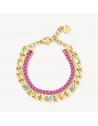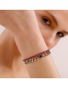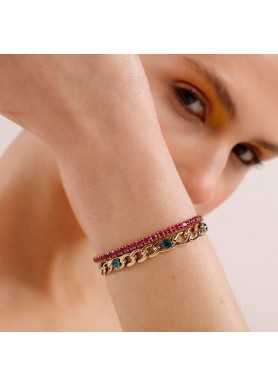 Bracciale in acciaio 304, pvd oro, catena figaro, cristalli indicolite, cubic zirconia ruby e pendente chiusura a forma di cuore.