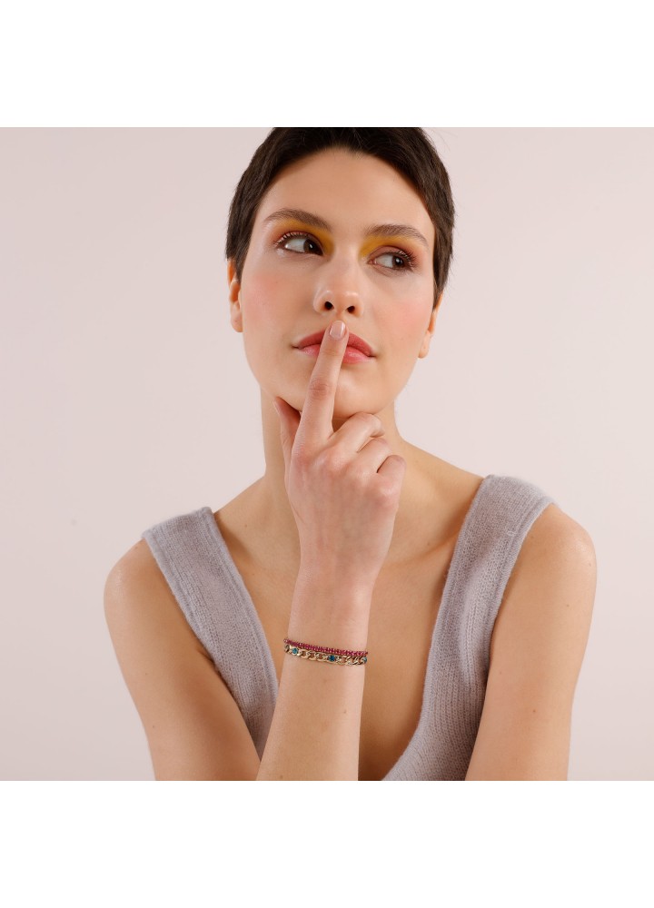 Bracciale in acciaio 304, pvd oro, catena figaro, cristalli indicolite, cubic zirconia ruby e pendente chiusura a forma di cuore. Gioiello della collezione Desideri. Lunghezza 180 mm. Referenza BEI070