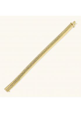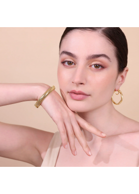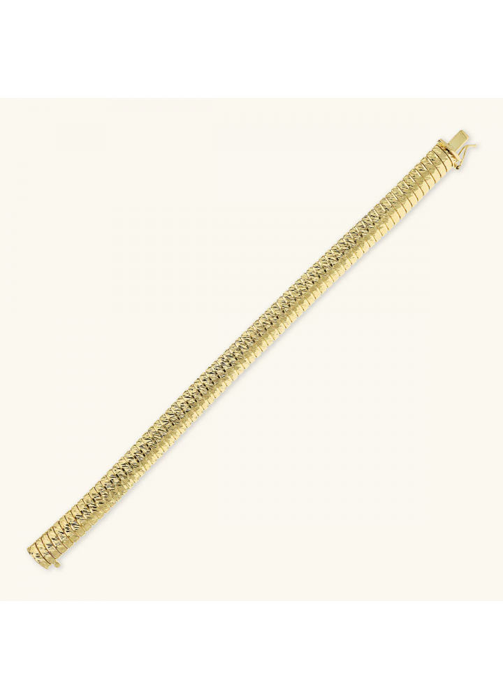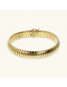 Bracciale tubogas realizzato in lega Golden, placcata oro giallo 18kt, con superficie lavorata. Chiusura a cassetta.