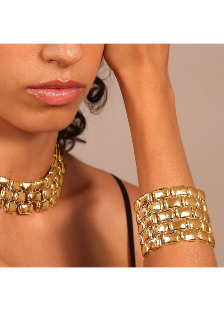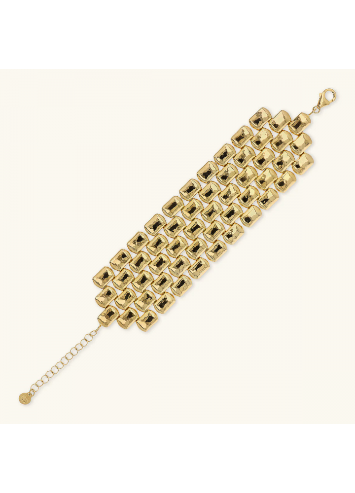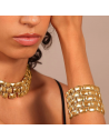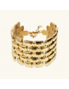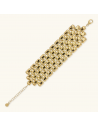 Bracciale a fascia Etrusca Gioielli realizzato in lega Golden, placcata Oro giallo 18kt, con maxi maglia pantera dall'ampia superficie martellata. Ampiezza superficie (5 cm). Lunghezza 19+5.5 cm di estensione. Chiusura a moschettone.