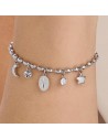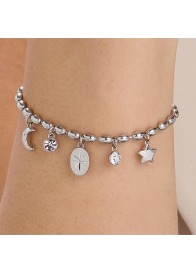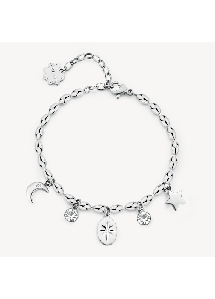 Segui la tua stella fortunata che illumina la via dei desideri. Sognare ti fa sentire viva ma solo la determinazione potrà trasformare il tuo sogno in una stupenda realtà! Bracciale in acciaio 316L e pendenti con luna, stella e cristalli.