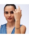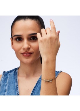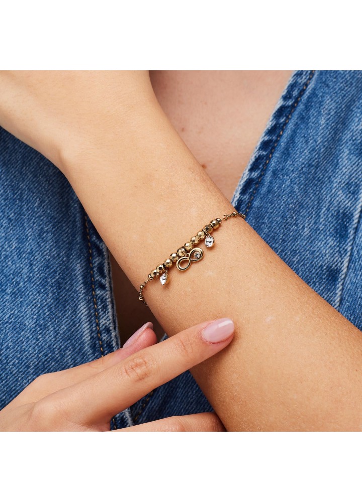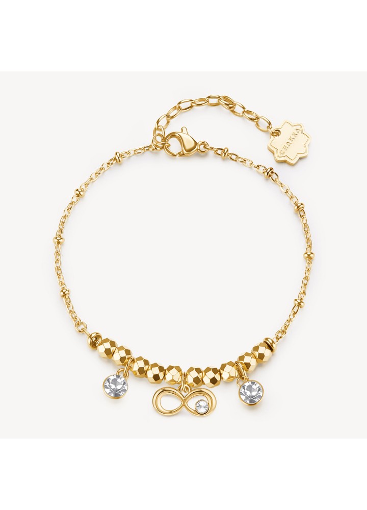 Bracciale in acciaio 316L e finitura pvd oro 14K, con pendenti con infinito e cristalli.