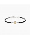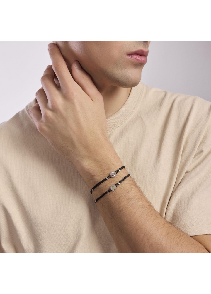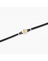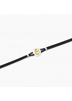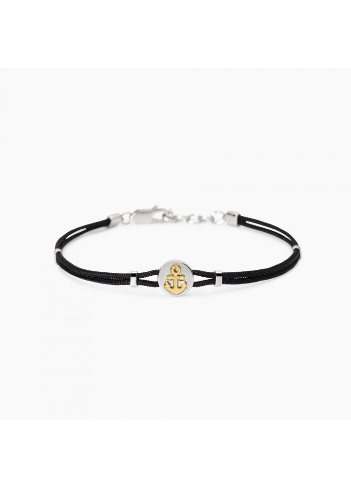 Bracciale regolabile da uomo in argento rodiato con cordino in nylon nero ed elemento ancora placcato oro.