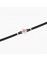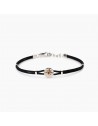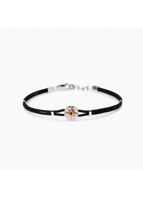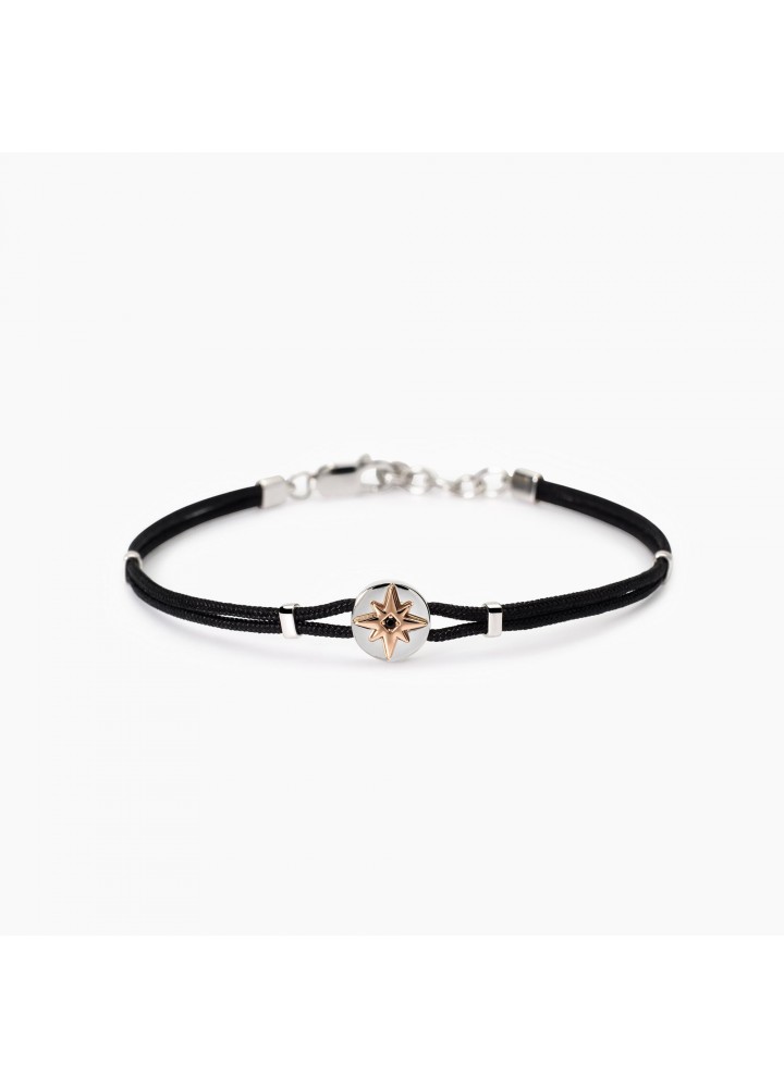 Bracciale regolabile da uomo in argento rodiato con cordino in nylon nero ed elemento Rosa dei venti placcato oro.