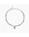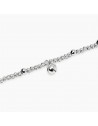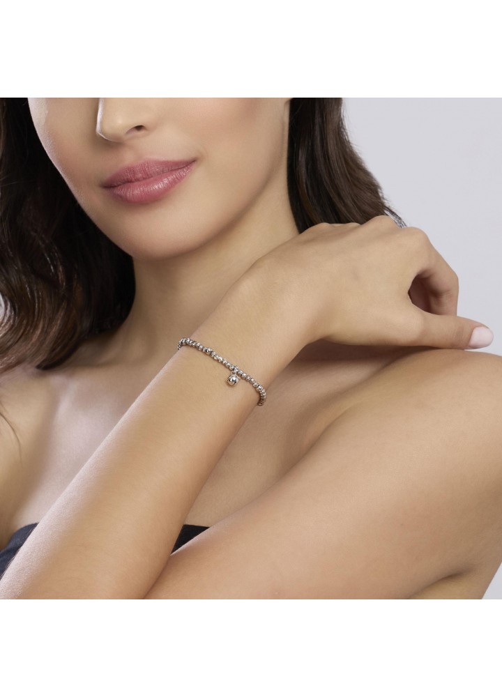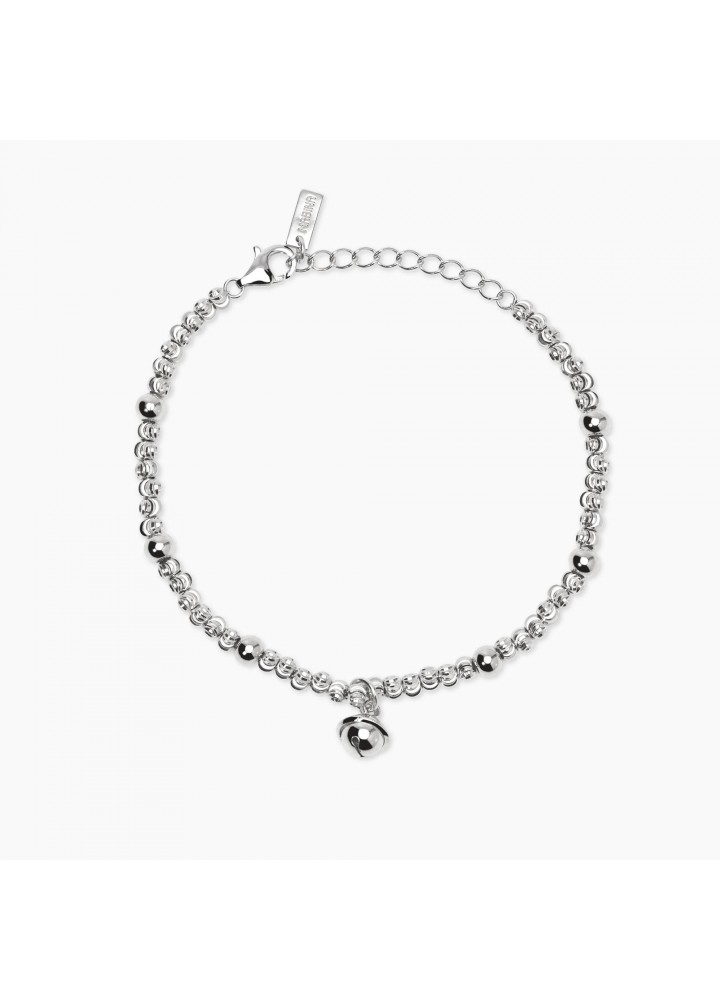 Bracciale regolabile in argento rodiato con sfere lucide e stirate, e ciondolo campanella.