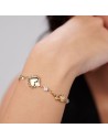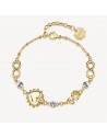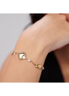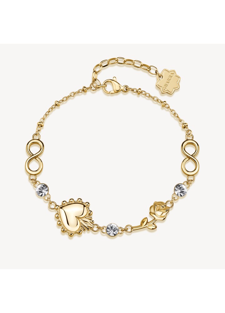 Bracciale in acciaio 316L e finitura pvd oro 14K, con cuore, rosa, infinito e cristalli.