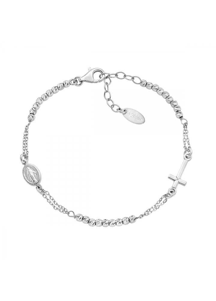 Bracciale in argento 925 con sfere diamantate da 2,5 mm. Ispirato ai bracciali rosario e impreziosito da una croce e dalla medaglietta rappresentante la Madonna Miracolosa, questo bracciale valorizza la fine bellezza dell'argento facendola risplendere in delicate sfere diamantate.