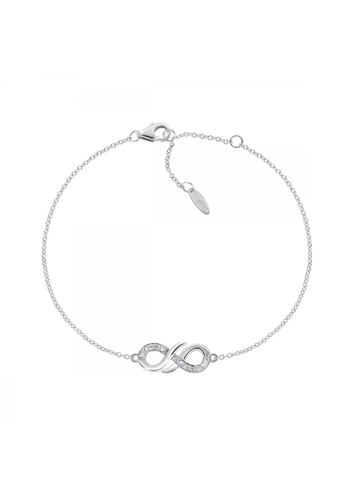 Bracciale in argento 925 rodiato con charm e zirconi bianchi. Un infinito che si intreccia per rappresentare i legami che durano nel tempo. Lunghezza regolabile da 16 a 19 cm.