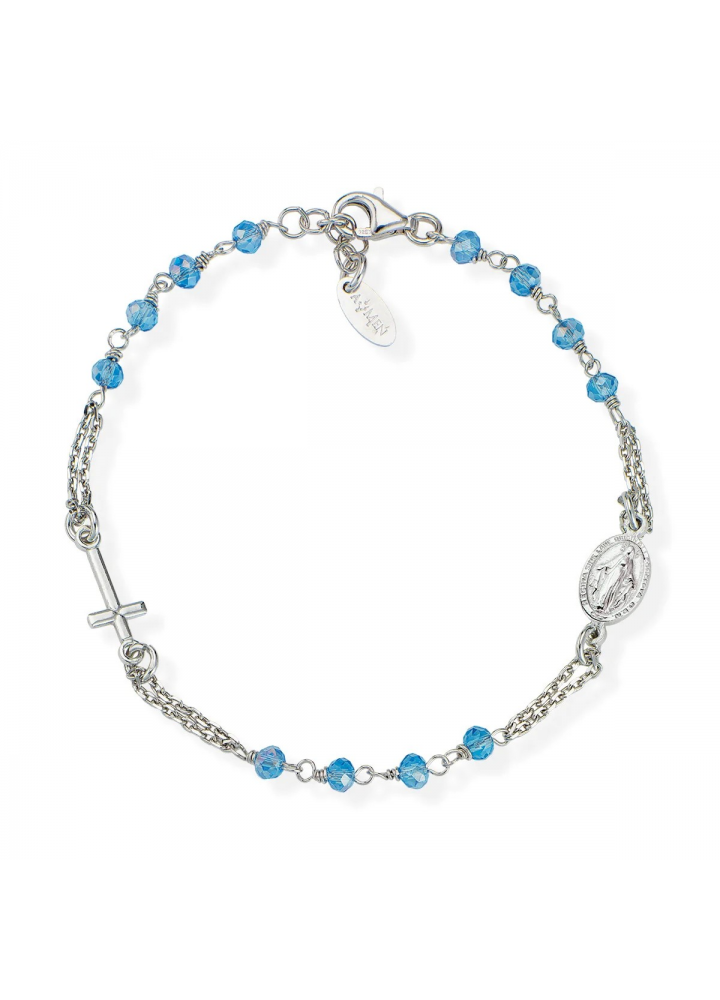 Bracciale rosario in argento 925 a finitura rodiata con grani da 3 mm di cristalli azzurri sfaccettati, croce e medaglietta rappresentante la Madonna Miracolosa. Il bracciale ha lunghezza regolabile da 18 a 20 cm con chiusura a moschettone e catenina di allungo.