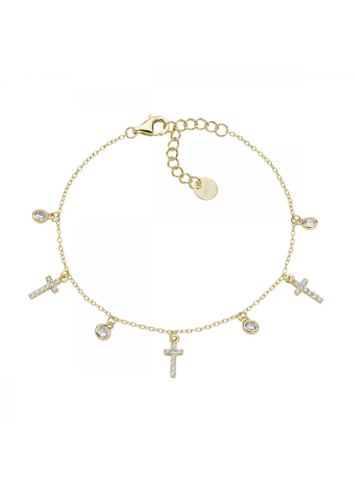Bracciale multicharm in argento 925 dorato con croci e zirconi bianchi pendenti. Lunghezza dei charm croce: 8 mm. Catena regolabile da 16 a 19 cm con allungo e chiusura a moschettone.