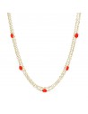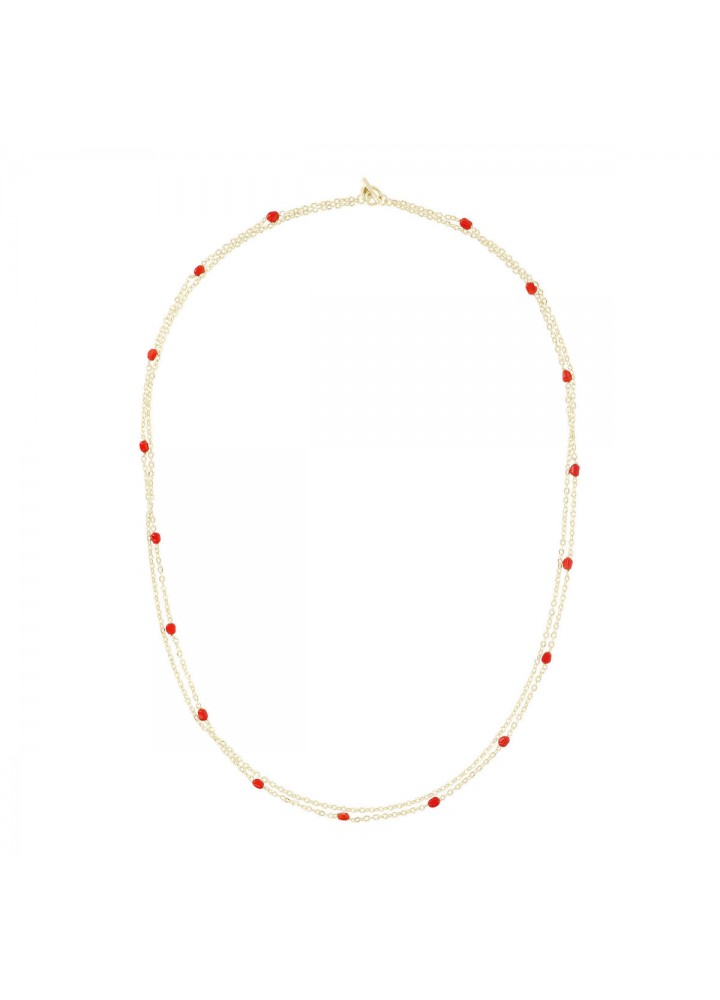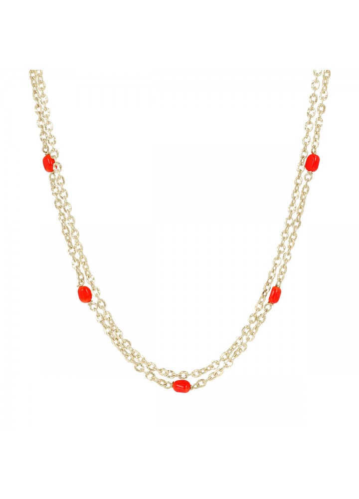 Collana composta da due catenine rolò, tra cui una impreziosita da Turchese o Corallo rosso. L'avvolgente placcatura in caldo oro giallo 18 carati è ispirata ai classici dell'oreficeria tutta made in Italy. Delicata e originale, questa collana a doppio filo è perfetta se abbinata a orecchini e bracciali della stessa collezione Etrusca, ma elegante anche portata sola per un effetto di femminilità assicurato.