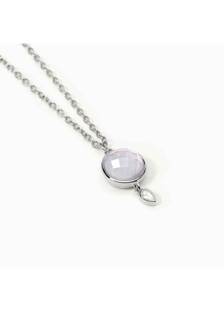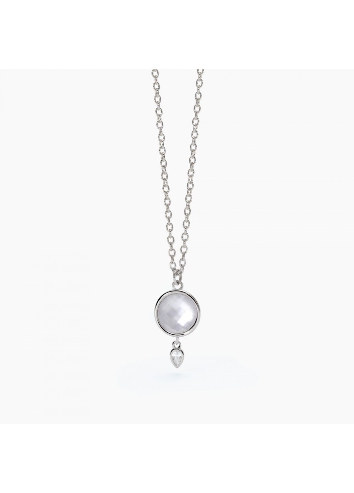 Girocollo da donna in argento rodiato con catena forzatina, cabochon sfaccettato doublet madreperla, cristallo di rocca e zirconi bianchi.