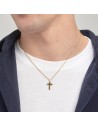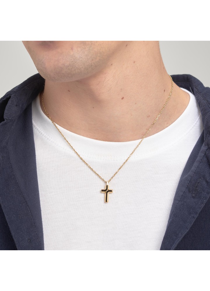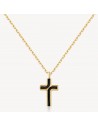 Collana in acciaio 316L e finitura pvd oro 14K con pendente a forma di croce e smalto nero.