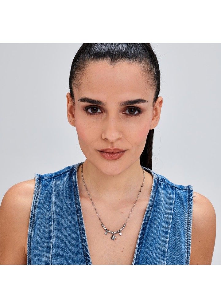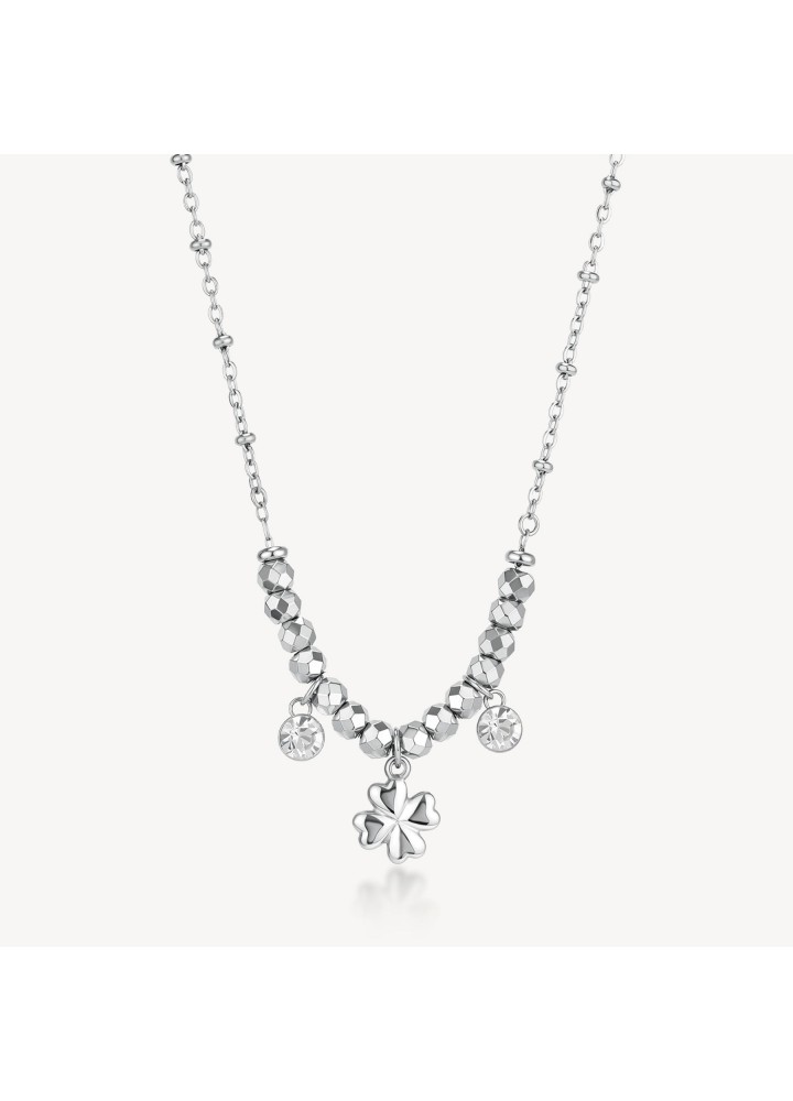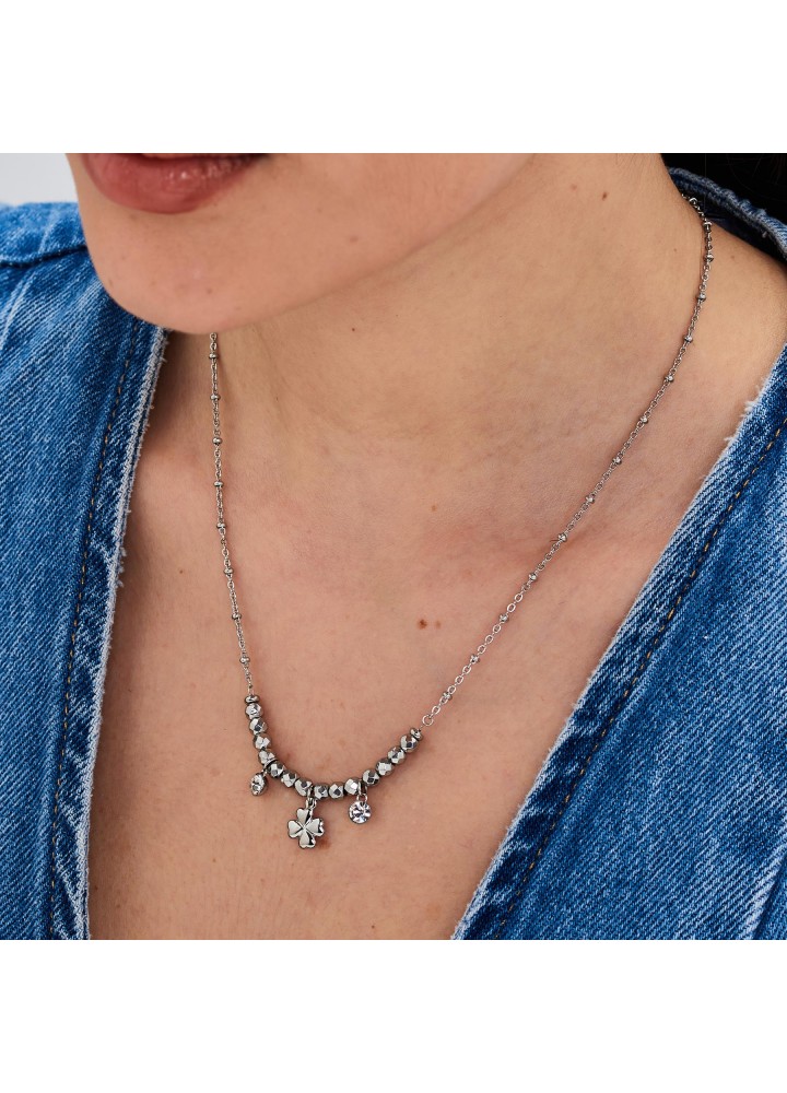 Collana girocollo in acciaio 316L e pendenti con quadrifoglio e cristalli.