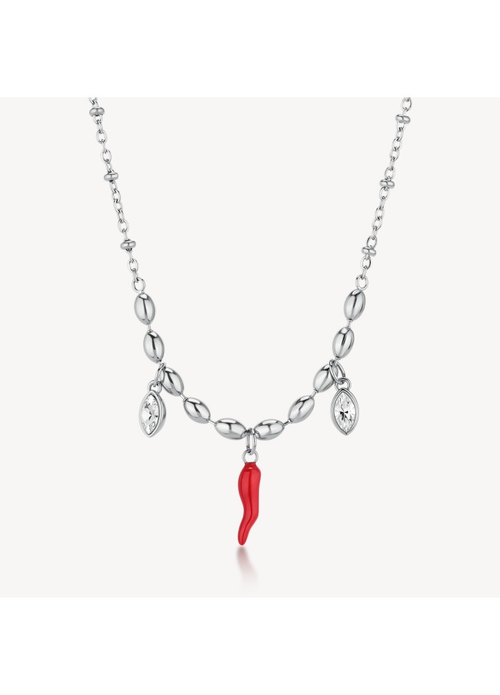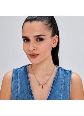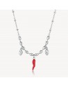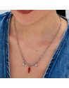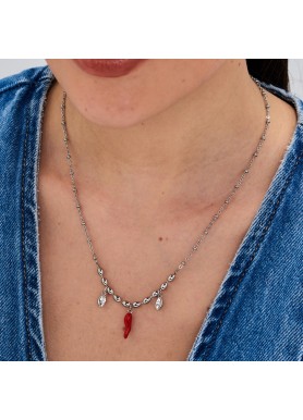 Collana girocollo in acciaio 316L e pendenti con cornetto con smalto rosso e cristalli.