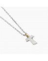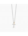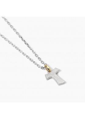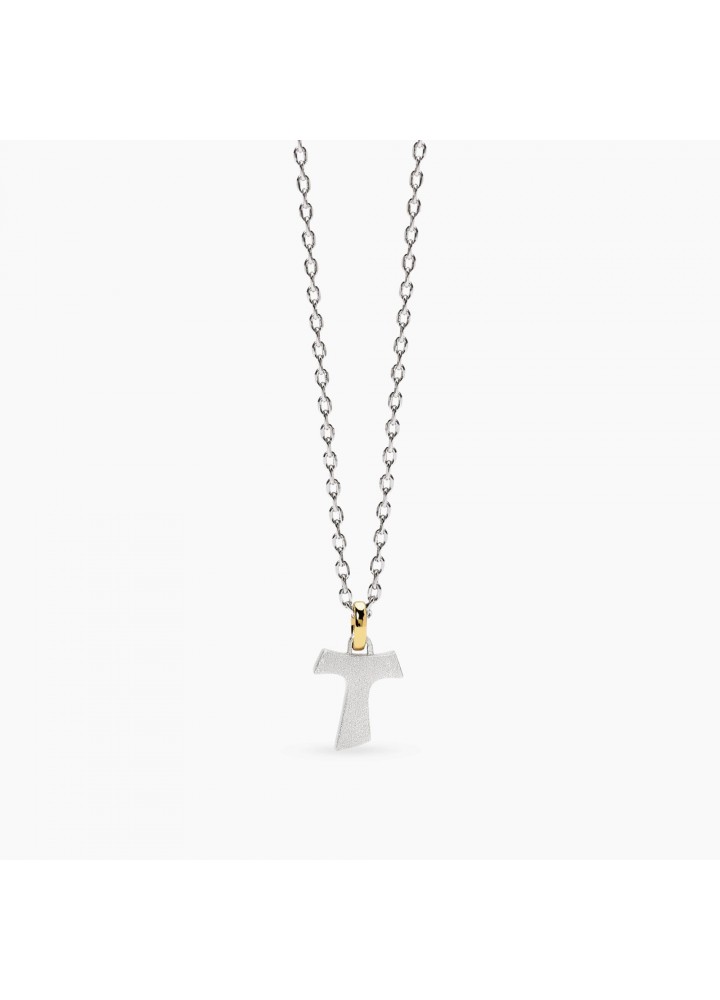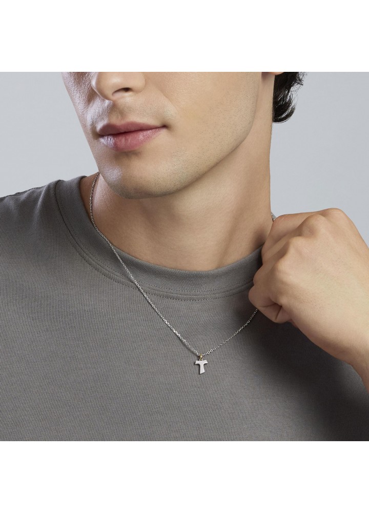 Collana in argento rodiato con catena forzatina diamantata e contromaglia placcata oro 18K con pendente croce Tau argento sabbiato.