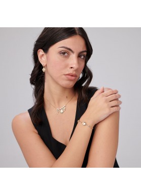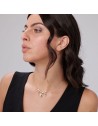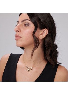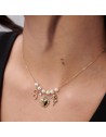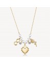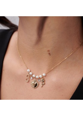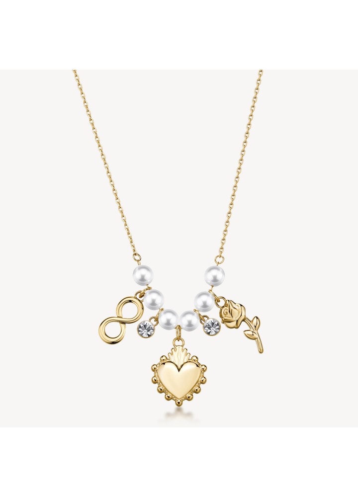 Collana girocollo in acciaio 316L e finitura pvd oro 14K, con pendenti a forma di cuore, rosa e infinito, con cristalli e perle di conchiglia.