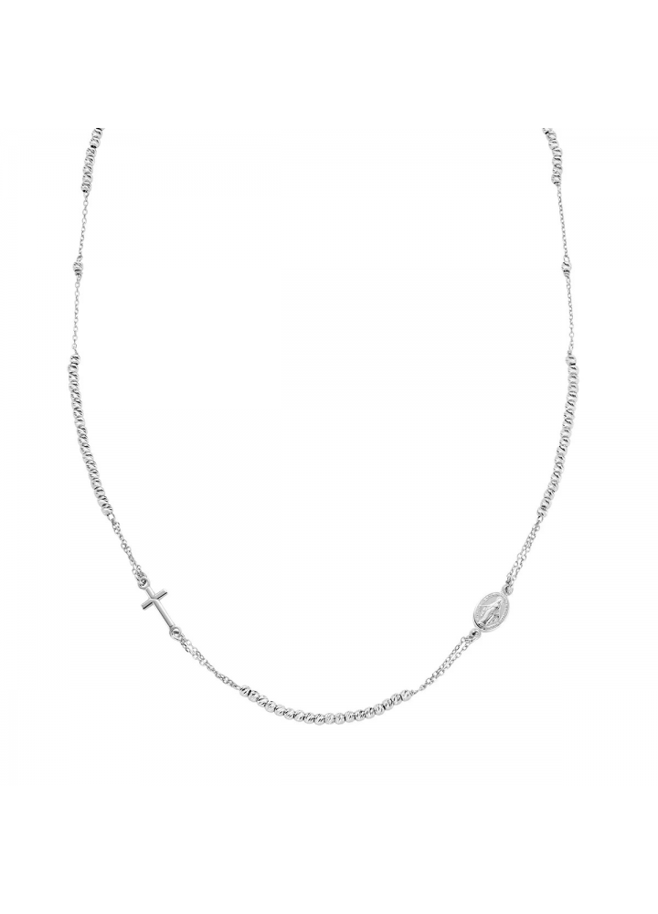 Collana in argento 925 con sfere diamantate da 2,5 mm. Ispirata ai rosari girocollo e impreziosita da una croce e dalla medaglietta rappresentante la Madonna Miracolosa, questa collana valorizza la fine bellezza dell'argento facendola risplendere in delicate sfere diamantate.
