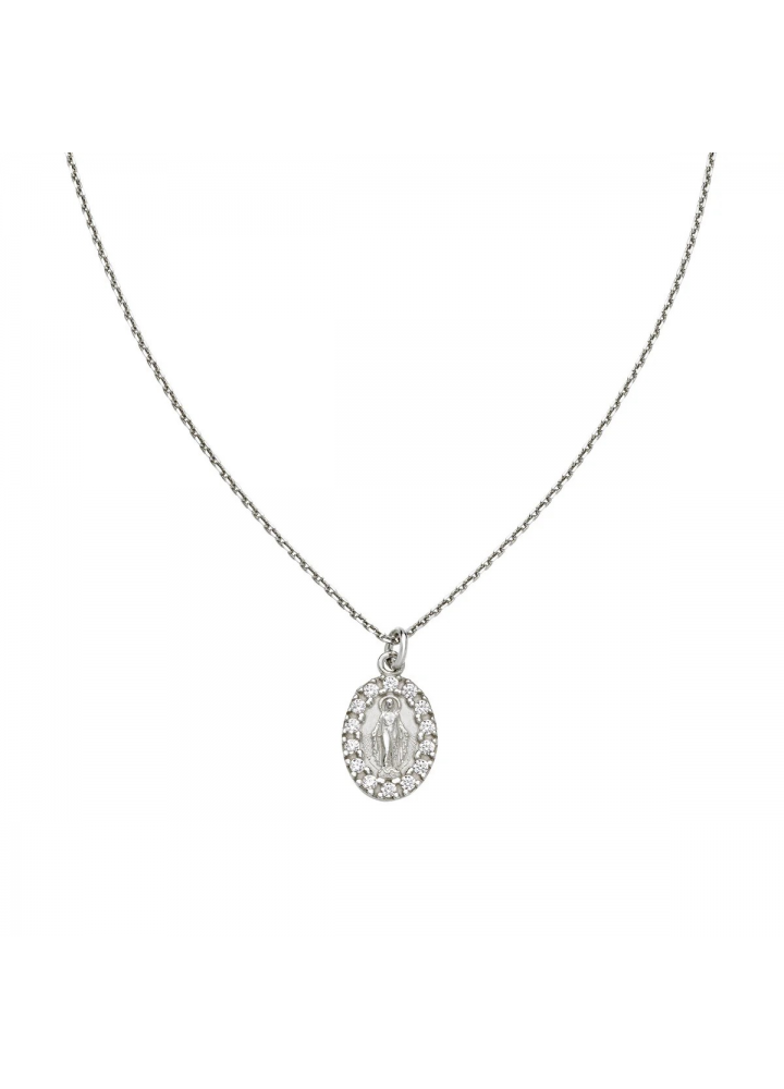 Collana in argento 925 rodiato con medaglietta Madonna Miracolosa bordata di zirconi bianchi. Il ciondolo è lungo 1,1 cm, mentre la catena ha lunghezza regolabile da 40 a 45 cm con allungo e chiusura a moschettone.