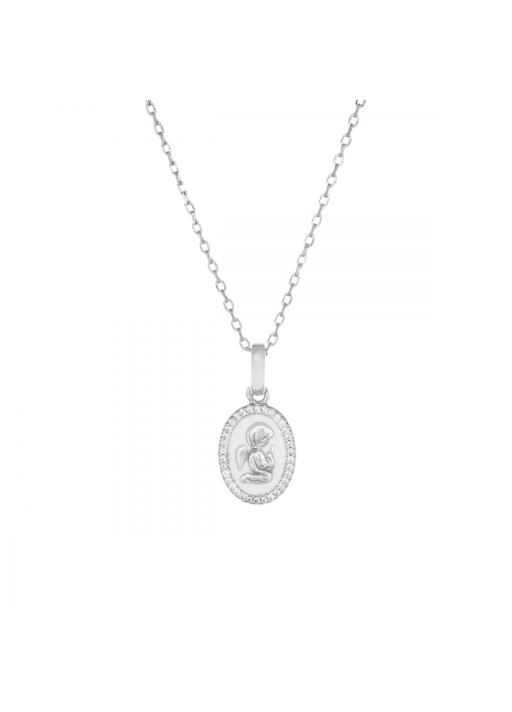 Collana in argento 925 rodiato con pendente di 1,1 cm. La medaglia raffigura un angelo su sfondo smaltato bianco con bordo di zirconi bianchi. Lunghezza regolabile da 35 a 40 e 45 cm.