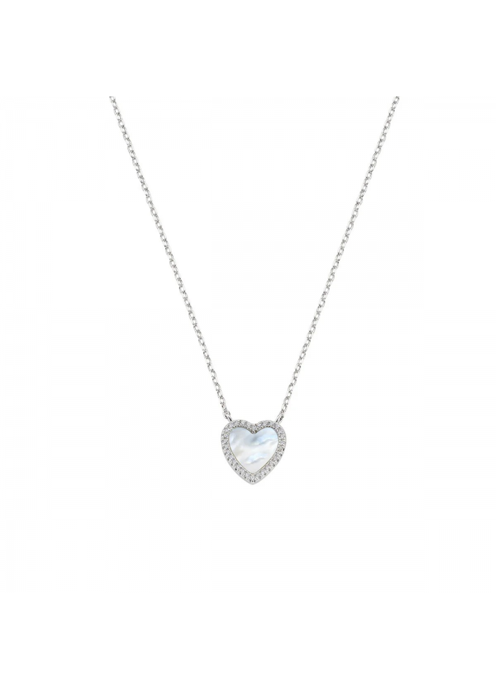 Collana in argento 925 rodiato, pendente cuore con madreperla e bordo di zirconi bianchi. Lunghezza regolabile da 40 a 45 cm con allungo e chiusura a moschettone. Dimensioni del pendente 1,2 x 1,2 cm.
