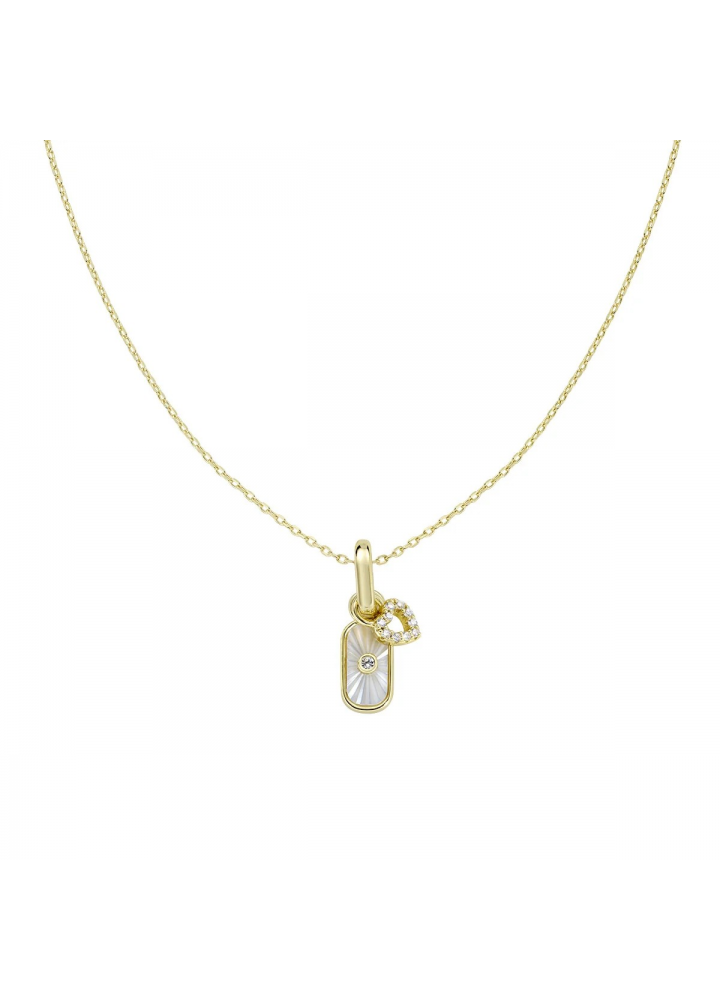 Collana in ottone dorato con doppio charm in madreperla di 1,7 cm e cuore di zirconi bianchi Lunghezza regolabile da 40 a 45 cm con allungo e chiusura a moschettone.