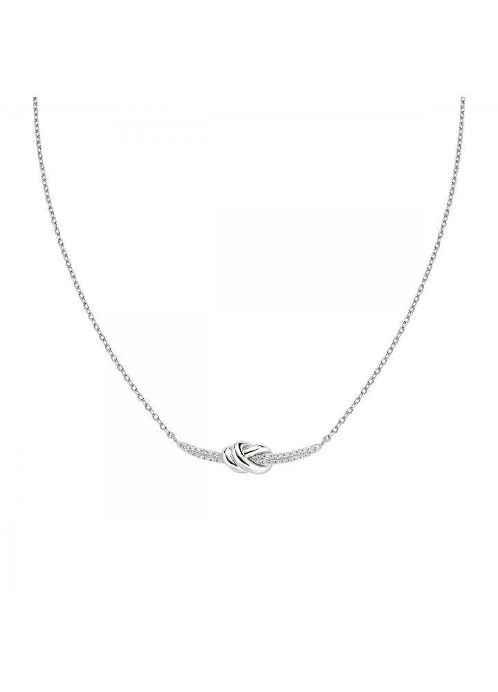 Collana in ottone a finitura rodiata con nodo centrale impreziosito da zirconi bianchi e lunghezza regolabile da 38 a 43 cm. Il Nodo d'Amore racconta l'intreccio tra due persone, unite in un legame e da un sentimento speciale. Questa collana, con un design fluido, essenziale e moderno, mette al centro ciò che l'altra persona rappresenta per noi: qualcosa di unico, speciale, una promessa che ci portiamo dentro e dura per sempre. Il regalo perfetto per parlare di un Amore assoluto.