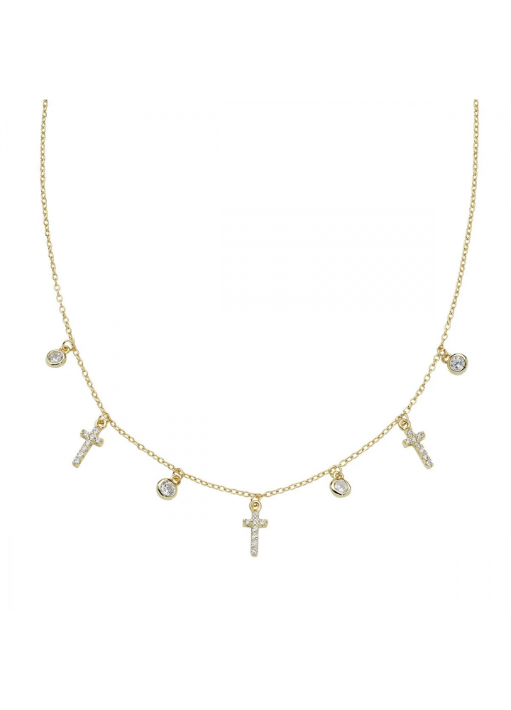 Collana multicharm in argento 925 dorato con croci e zirconi bianchi pendenti. Lunghezza dei charm croce: 8 mm. Catena regolabile da 38 a 43 cm con allungo e chiusura a moschettone.
