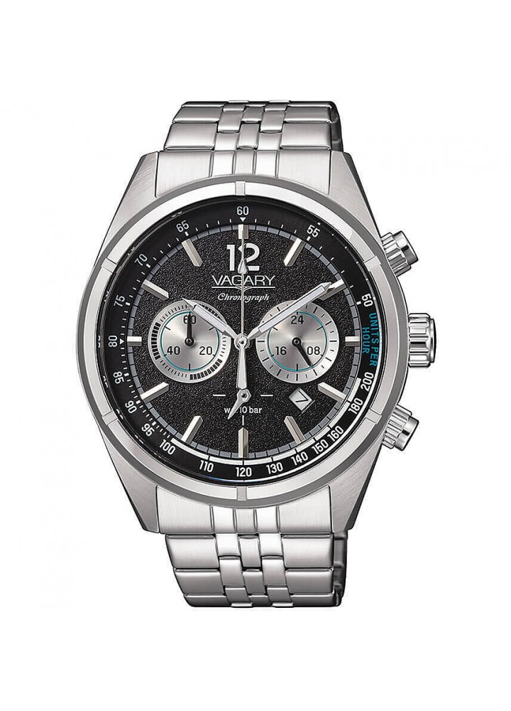 Orologio da uomo di Vagary della collezione Rockwell. Cronografo con movimento al quarzo citizen e resistenza all'acqua di 10 ATM. La cassa é in acciaio con lunetta fitta con diametro di 42 mm. Quadrante nero con indici applicati. Bracciale in acciaio con chiusura a pulsante. Presenza di datario e vetro minerale.