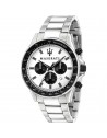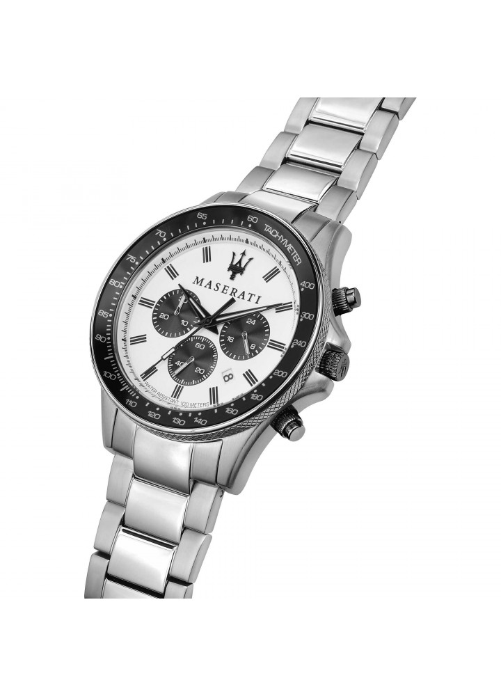 Orologio Cronografo Da Uomo Di Maserati Della Collezione Sfida. L'Orologio È Realizzato In Acciaio, Con Cassa Rotonda Realizzata Con Finitura Satinata. Il Bracciale È In Metallo Di Colore Argento Con Chiusura Di Sicurezza. Il Quadrante È Di Colore Bianco Con Vetro Minerale. Il Movimento È Al Quarzo. La Resistenza All'Acqua È Di 10 Atm. La Referenza È R8873640003
