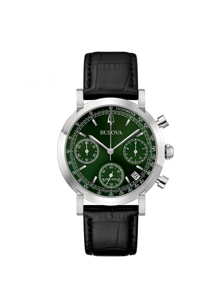 Orologio Bulova Uomo Cronografo High Precision 262kHz cinturinato pelle nero e quadrante verde.