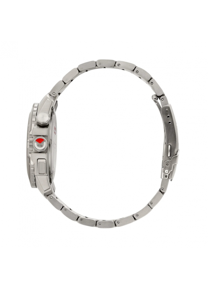 Materiale e finitura cassa: Acciaio, Tessuto, Misura cassa: 43.00mm, Spessore cassa: 10.89mm, Colore cassa: Silver, Vetro: Vetro minerale, Materiale cinturino: Acciaio, Colore cinturino: Silver, Chiusura: Fibbia diver c/pulsanti e blocco di sicurezza, Movimento: Quarzo, Water resistant: 10 atm
