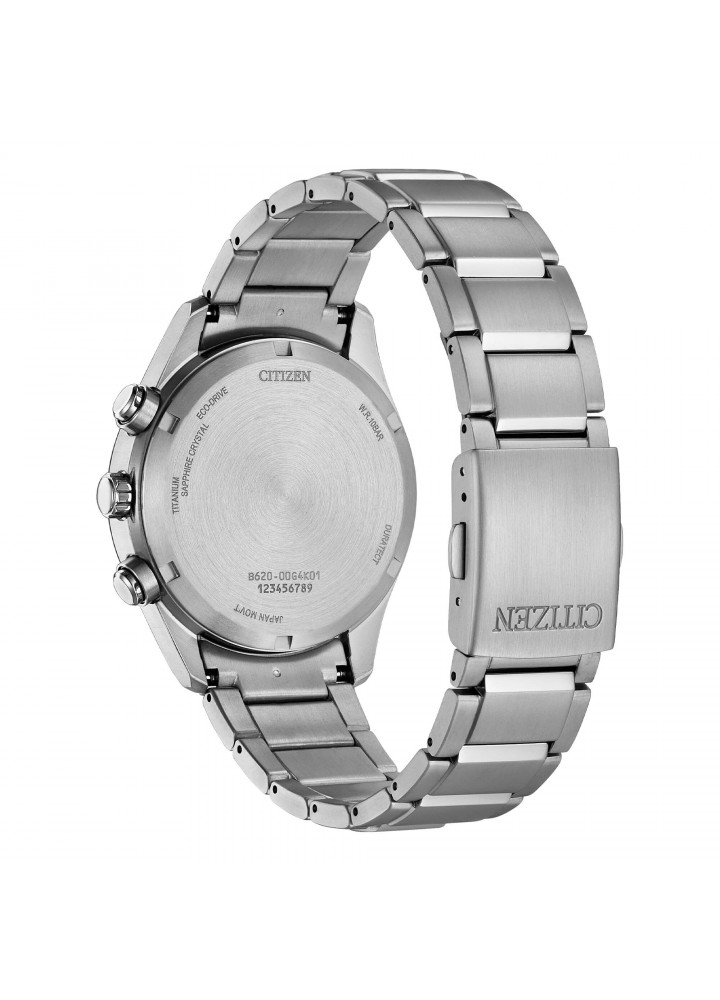 Calibro: B620 Tipo di calibro: Cronografo analogico Caratteristiche del calibro: Display 24 ore su 24, Eco-Drive, +/- 15 secondi al mese, 270 giorni, Indicatore di scarica della batteria, Data, Cronometro: massimo 60 min, 1/5 di secondo Riserva di Marcia: 270 giorni Colore del quadrante: Blu Indice a quadrante: Stroke Glas: Vetro antiriflesso in zaffiro