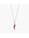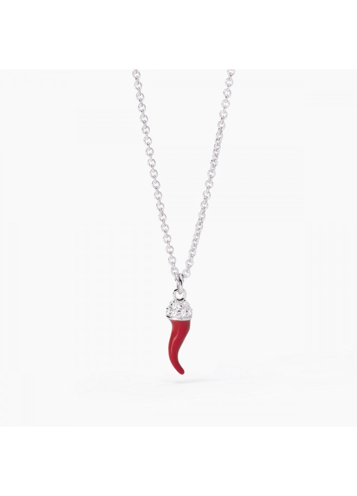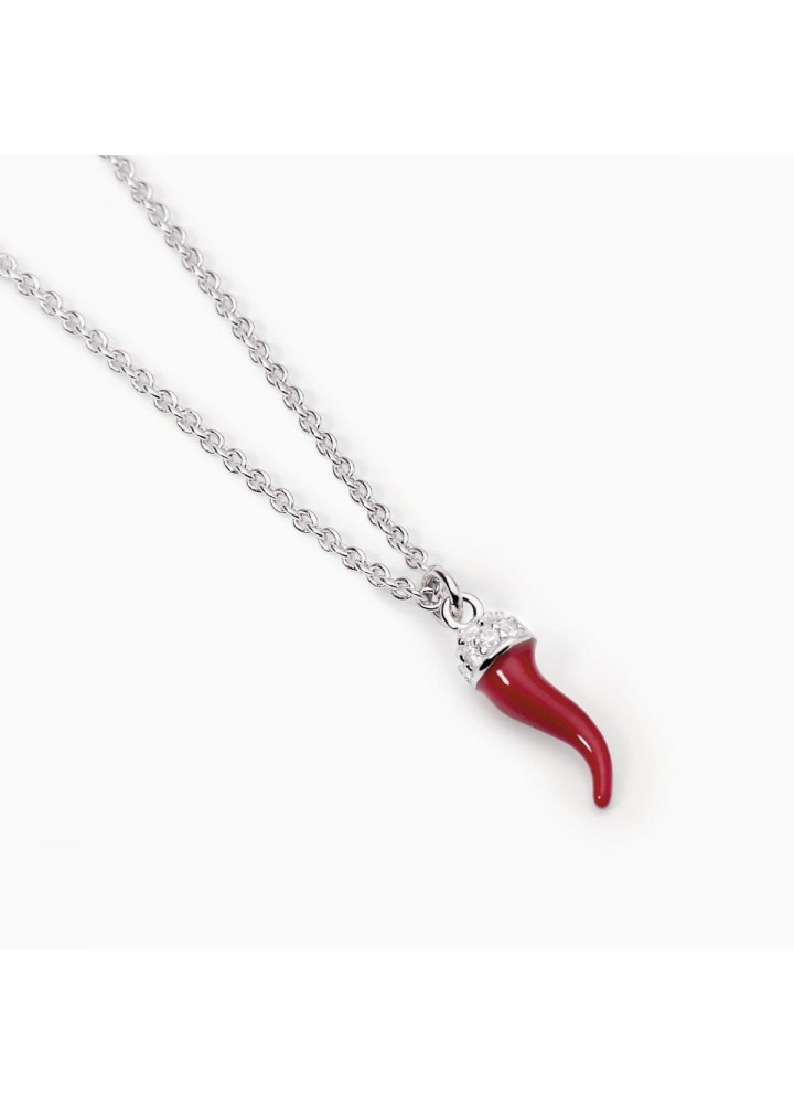 Girocollo regolabile da donna in argento rodiato con catena forzatina e pendente smaltato a forma di cornetto e zirconi.