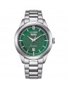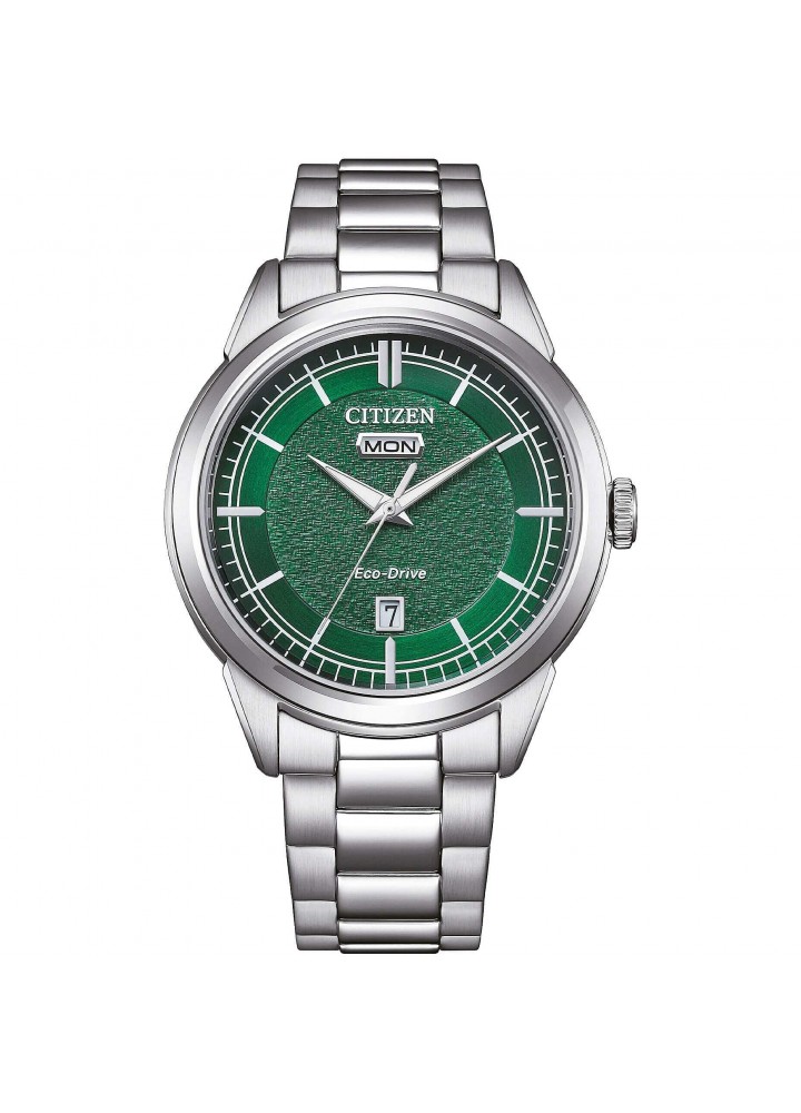 Orologio di Citizen della collezione OF Collection 2026. Orologio eco drive da uomo con cassa in acciaio con fondello serrato a vite e diametro di 40 mm; quadrante verde day date con indici applicati e vetro minerale. Bracciale in acciaio con chiusura a pulsante. Resistenza all’acqua di 10 ATM e movimento eco drive con riserva di carica fino a 8 mesi.