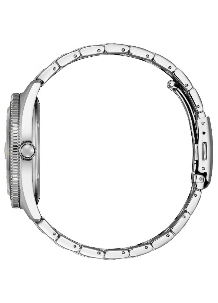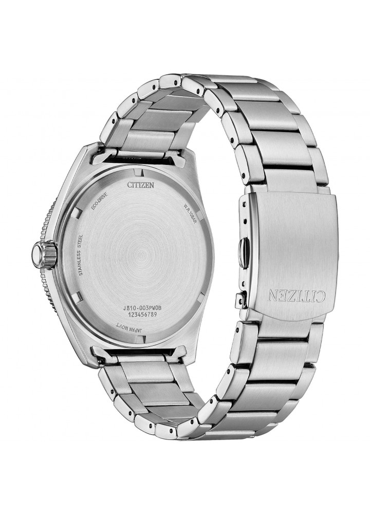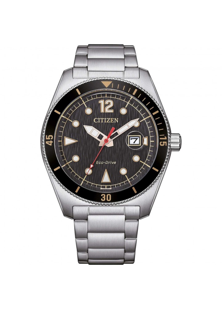 Orologio di Citizen della collezione OF Collection 2026. Orologio eco drive da uomo con cassa in acciaio con fondello serrato a vite e diametro di 43 mm; quadrante nero con indici applicati e ghiera girevole nera, vetro minerale. Bracciale in acciaio con chiusura a pulsante. Resistenza all’acqua di 10 ATM e movimento eco drive con riserva di carica fino a 8 mesi.