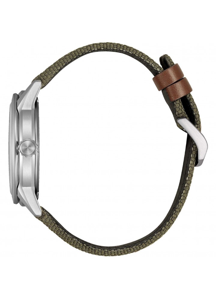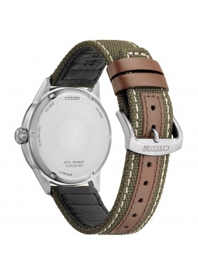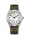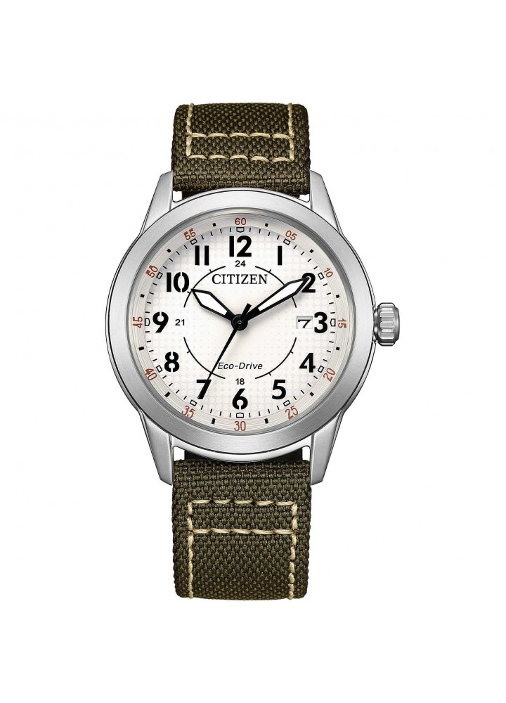 Orologio di Citizen della collezione OF Collection 2026. Orologio eco drive da uomo con cassa in acciaio con fondello serrato a vite e diametro di 40 mm; quadrante bianco con numeri arabi e vetro minerale. Cinturino in nylon verde. Resistenza all’acqua di 10 ATM e movimento eco drive con riserva di carica fino a 8 mesi.