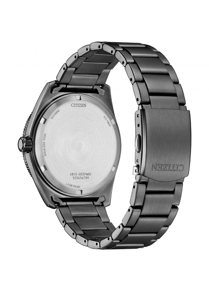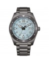 Orologio di Citizen della collezione OF Collection 2026. Orologio eco drive da uomo con cassa in acciaio IP grey con fondello serrato a vite e diametro di 43 mm; quadrante turchese con indici applicati e ghiera girevole nera, vetro minerale. Bracciale in acciaio IP grey con chiusura a pulsante. Resistenza all’acqua di 10 ATM e movimento eco drive con riserva di carica fino a 8 mesi.